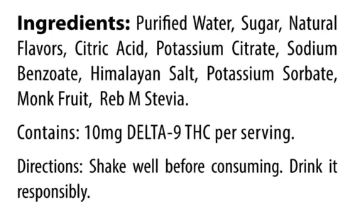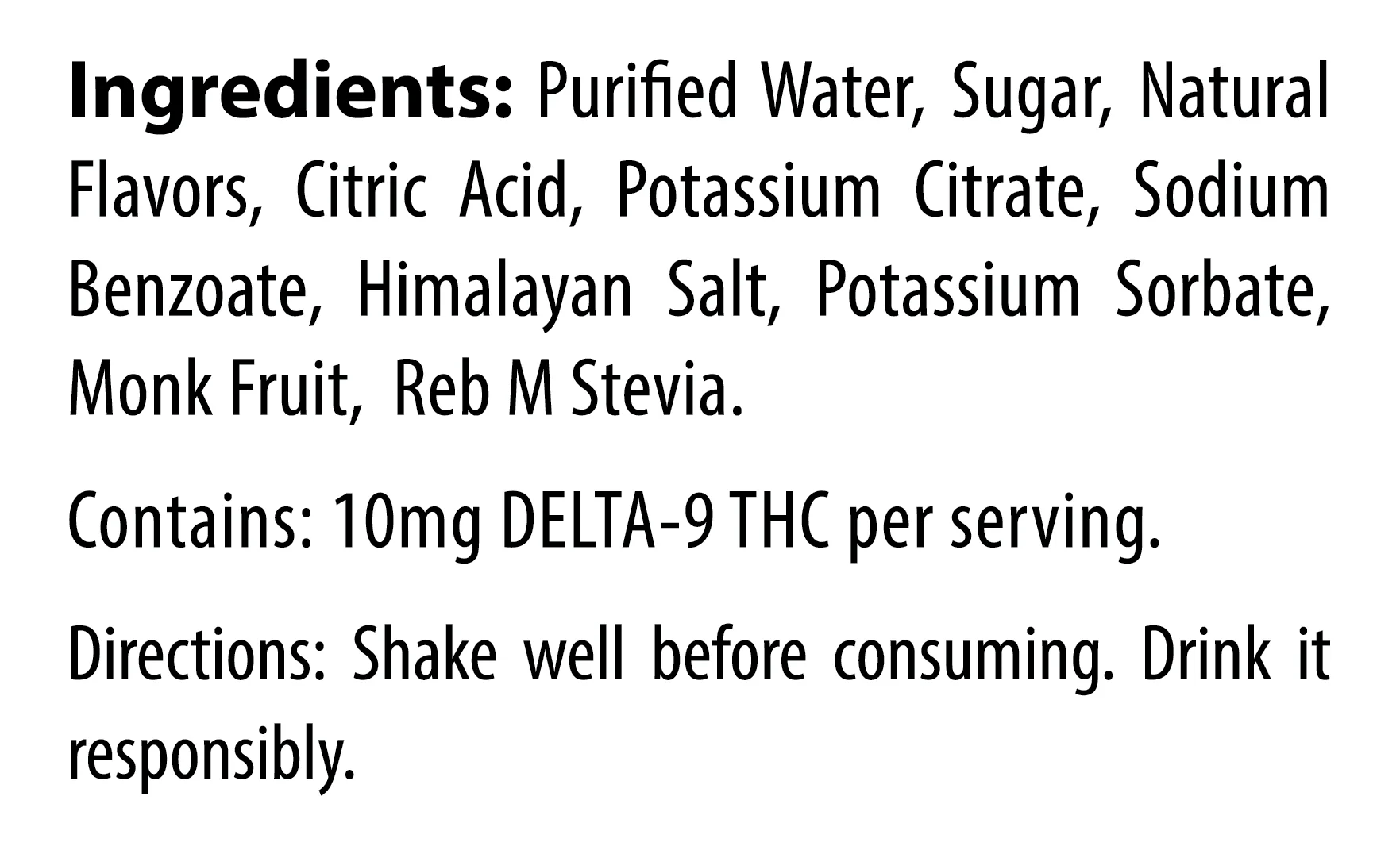 Agua filtrada, azúcar de caña, sabores naturales, ácido cítrico, citrato de potasio, benzoato de sodio, citrato de sodio, sorbato de potasio, Reb M (extracto de estevia), extracto de fruta del monje y sal del Himalaya.